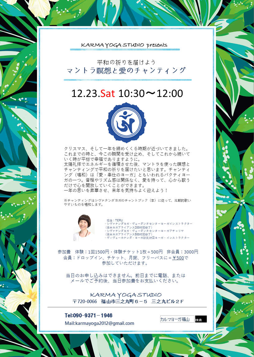 2019/10/1512月23日(土・㊗)10:30~12:00 ~平和の祈りを届けよう~ マントラ瞑想と愛のチャ... 続きを読む