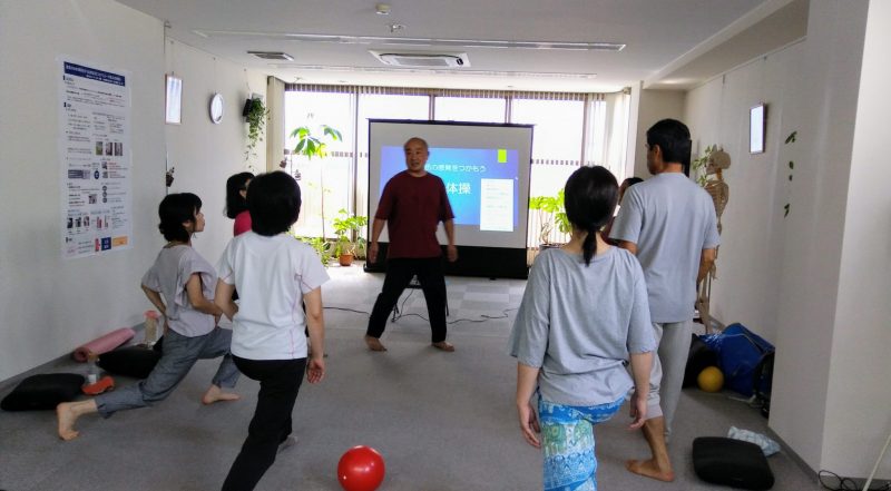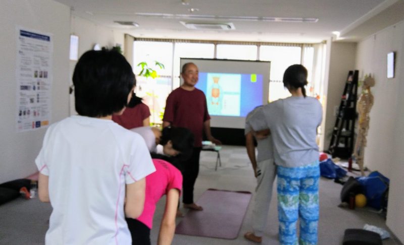 足の裏の目を開く、大腰筋、背骨の役割、腰痛の原因になる筋肉、身体構造に添った歩き方や、地球に支えてもらいながらの固定点のない動きなど、映像とオリジナルのエクササイズを交えて、分かりやすく教えていただきました。2部では、大腰筋と頚長筋、心と身体、頭を開く、音の瞑想で、身体から空間、エネルギー体、宇宙へと意識を広げました。