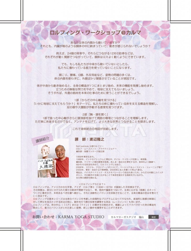 渡辺さん自身の経験やロルブァーの視点から、身体だけではなく、心と姿勢、トラウマ(トラウマを扱うロルフィングもあるらしい)までふれる、とても興味深い、オリジナリティあふれるWSです。