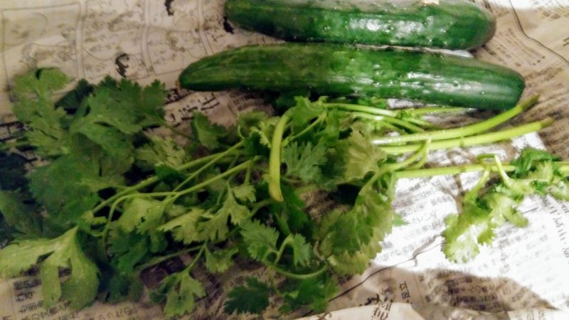 今日は、トミちゃんがパクチーときゅうりを持ってきてくれました。