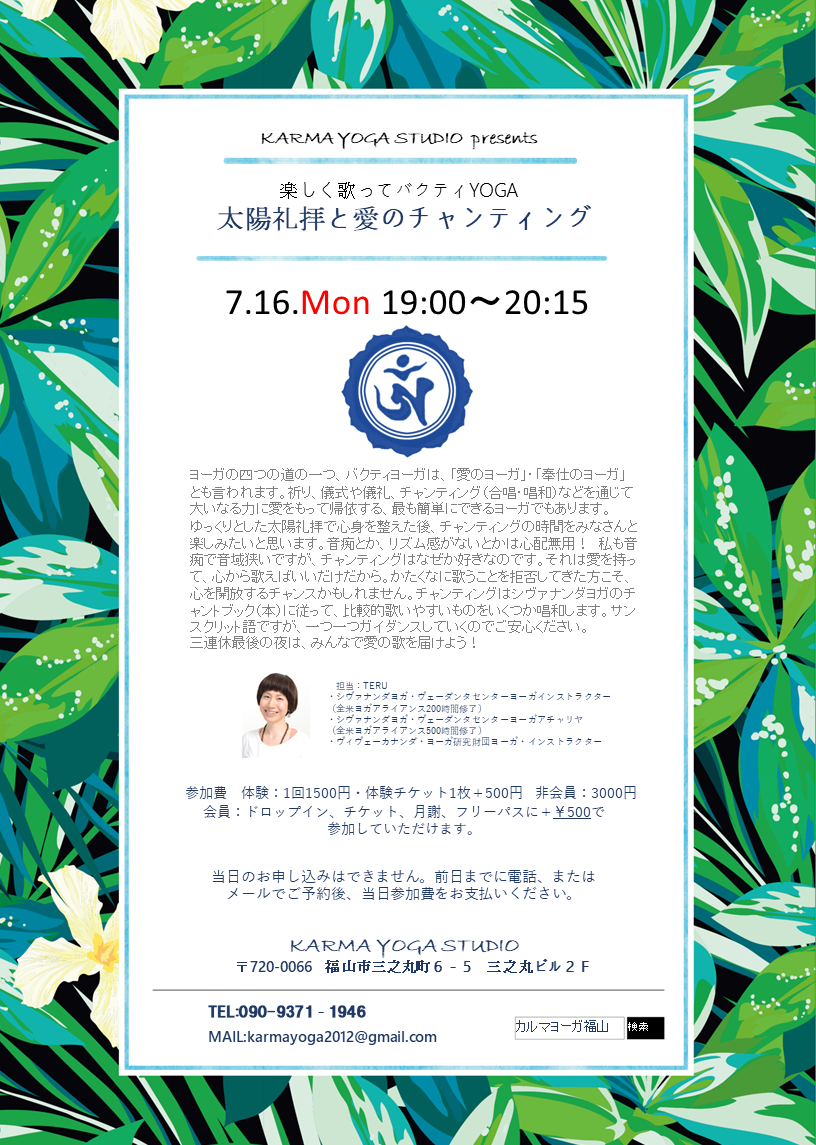 2018/06/197月16日(月)19:00~20:15 ㊗~楽しく歌ってバクティYOGA~太陽礼拝と愛のチャンティン... 続きを読む